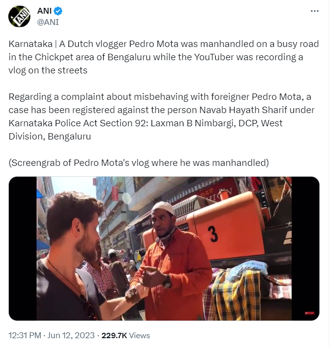 बेंगलुरु के चोर बाजार में डच यूट्यूबर के साथ बदसलूकी, व्यापारी ने हाथ पकड़कर वीडियो बनाने पर जताई थी आपत्तिबेंगलुरु में एक डच YouTuber Pedro Mota के साथ दुर्व्यवहार करने के आरोप में एक व्यापारी को गिरफ्तार किया गया है। पूरे भारत में यात्रा कर रहे पेद्रो एक यूट्यूबर ब्लॉगर है और वह 11 जून को एक वीडियो ब्लॉग की शूटिंग करने के लिए बेंगलुरु के चिकपेट के एक चोर बाजार पहुंचे थे। इस दौरान एक स्थानीय व्यापारी ने उनके साथ बदसलूकी करना शुरू कर दिया।