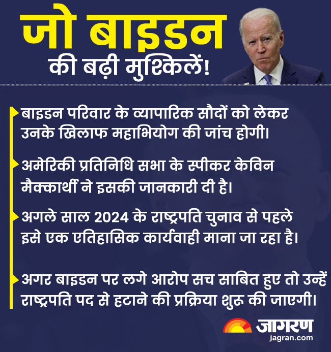 अमेरिकी संविधान में प्रावधान है कि कांग्रेस देशद्रोह रिश्वतखोरी या अन्य उच्च अपराधों की स्थिति में राष्ट्रपति पर महाभियोग चला सकती है। इसकी जांच संसदीय समिति द्वारा की जाएगी। महाभियोग की प्रक्रिया दो चरण में चलाई जाती है। अगर अमेरिकी राष्ट्रपति जो बाइडन पर लगे आरोप सच साबित हुए तो उन्हें राष्ट्रपति पद से हटाने की प्रक्रिया शुरू की जाएगी। बता दें कि अगले साल अमेरिका में राष्ट्रपति चुनाव है।