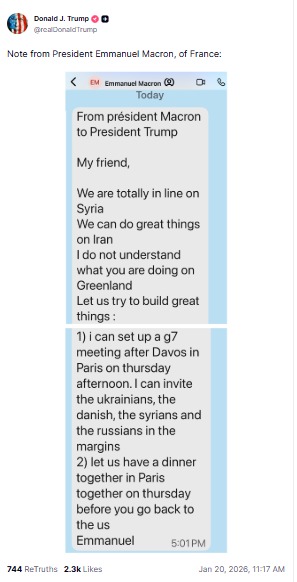 ट्रंप ने ट्रुथ सोशल पर फ्रांसीसी राष्ट्रपति इमैनुएल मैक्रों का एक प्राइवेट मैसेज भी शेयर कर दिया, जिसमें ग्रीनलैंड मुद्दे पर बात हुई थी। ट्रंप का यह हमला तब हुआ जब फ्रांस ने 'बोर्ड ऑफ पीस' में शामिल होने से इनकार कर दिया।