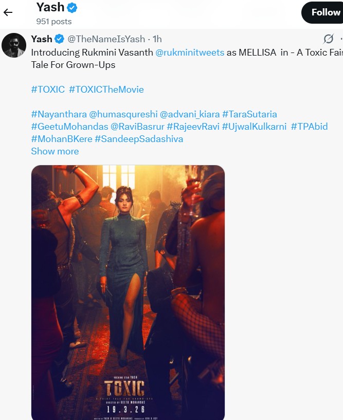मेकर्स ने सोशल मीडिया पर रुक्मिणी का फर्स्ट-लुक पोस्टर रिवील किया, जिसमें उन्हें मेलिसा के तौर पर इंट्रोड्यूस किया गया है, जो एक शांत, प्रभावशाली और दृढ़ किरदार है। 1960 के दशक के आखिर की एक धुंधली पार्टी सीन के बैकग्राउंड में, इस झलक में मेलिसा को शांत अंदाज में आगे बढ़ते हुए दिखाया गया है, उनका फोकस्ड एक्सप्रेशन आसपास की अफरा-तफरी से बिल्कुल अलग है।