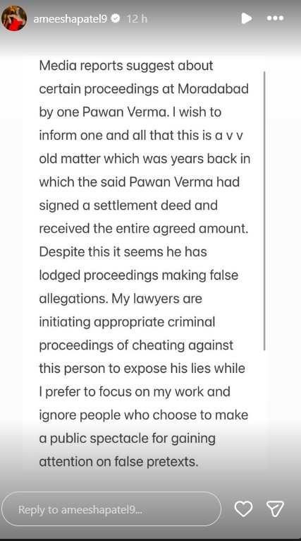 एडिशनल सिविल जज (जूनियर डिवीजन) कोर्ट से बार-बार समन मिलने के बावजूद, अमीषा कथित तौर पर पेश नहीं हुईं, जिसके बाद कोर्ट ने उनकी मौजूदगी पक्की करने के लिए नॉन-बेलेबल वारंट जारी किया। लेकिन अब अमीषा ने इस पर चुप्पी तोड़ते हुए मामले पर अपना रूख स्पष्ट किया है।