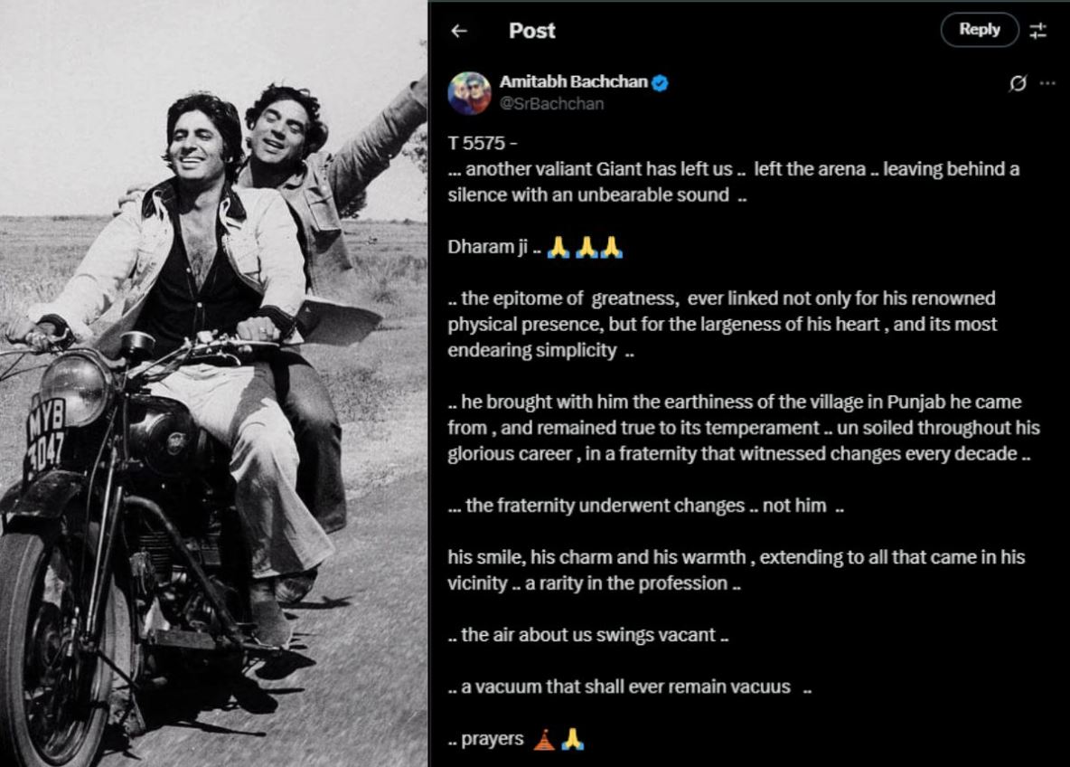 आपको बता दें कि अमिताभ के सबसे करीबी दोस्त और बड़े भाई समान वीरू यानि एक्टर धर्मेंद्र का पिछले साल अक्टूबर में निधन हो गया था। धर्मेंद्र के निधन के बाद भी अमिताभ ऐसे ही टूट गए थे, तब भी महानायक ने सोशल मीडिया पर अपने बड़े भाई और 'वीरू' के लिए कई पोस्ट किए थे। अब धर्मेंद्र के बाद महानायक के एक और खास दोस्त का निधन हो गया है।