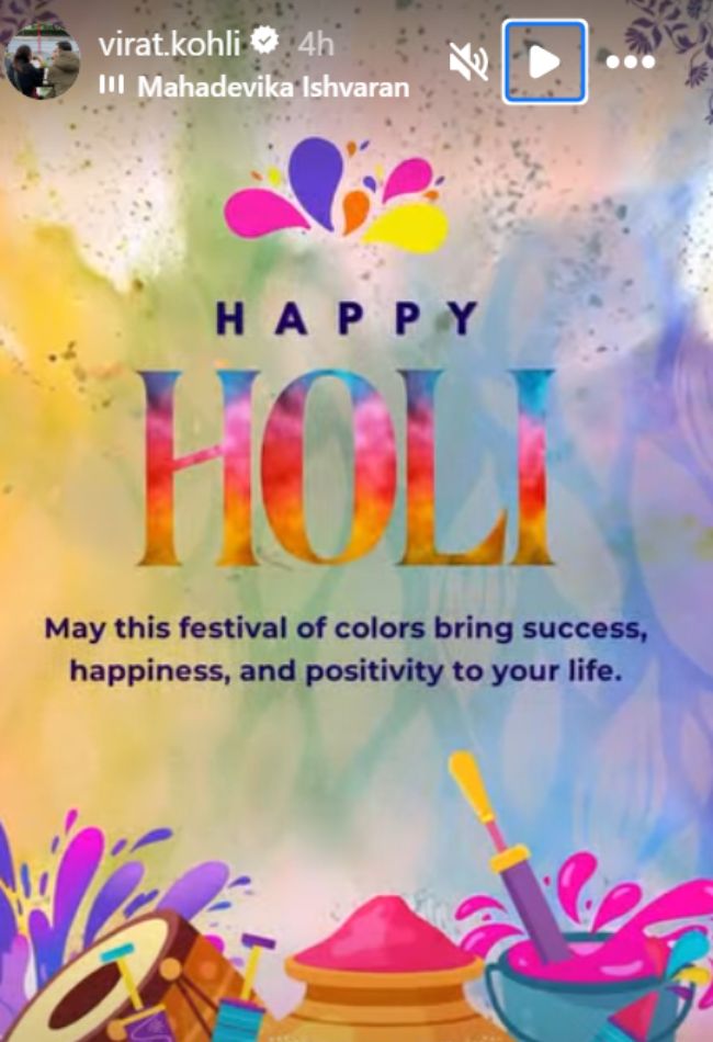 विराट कोहली ने अपने इस्टाग्राम पर एक स्टोरी साझा किया और लिखा, "होली का हार्दिक शुभकामनाएं। ये त्योहार आपके जीवन में खुशियां और सकारात्मकता लेकर आए।"