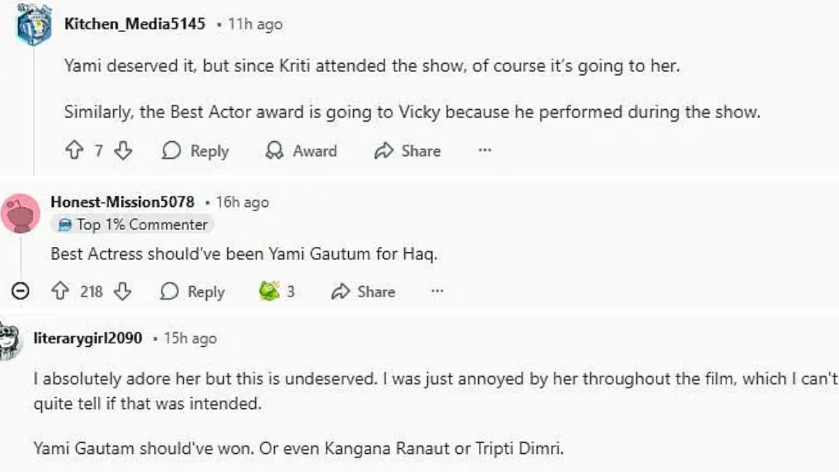 एक यूजर ने कमेंट कर लिखा है- मेरे हिसाब से फिल्म हक के लिए यामी गौतम को बेस्ट एक्ट्रेस चुना जाना चाहिए था। दूसरे यूजर का मानना है- मुझे लगता है कि कृति इसके लायक हैं, उनकी जगह बेस्ट एक्ट्रेस का पुरस्कार यामी गौतम या कंगना रनौत को मिलना चाहिए था। इस तरह से तमाम लोग अपनी-अपनी राय रख रहे हैं।