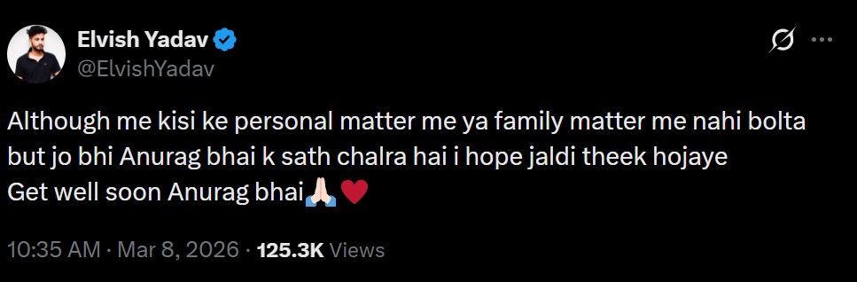 एल्विश यादव ने अनुराग डोभाल को लेकर एक्स हैंडल पर ट्वीट लिखा है। उन्होंने कहा, "यूं तो मैं किसी के पर्सनल मैटर में या फैमिली मैटर में नहीं बोलता हूं लेकिन जो भी अनुराग भाई के साथ चल रहा है। मुझे उम्मीद है कि जल्दी ठीक हो जाए। जल्दी ठीक हो जाओ अनुराग भाई।"