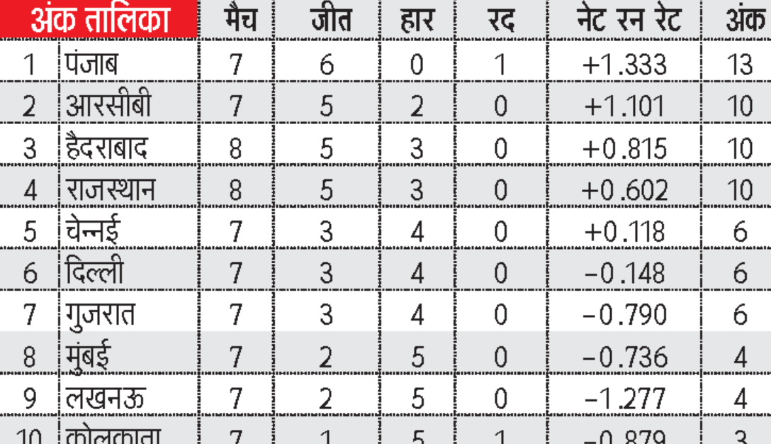 उनका नेट रन रेट +1.333 का है। दूसरे पायदान पर आरसीबी की टीम बेहतर नेट रन रेट के साथ मौजूद है। सीएसके की टीम पांचवें स्थान पर है, जिसने एमआई के खिलाफ 103 रन की बड़ी जीत दर्ज कर नेट रन रेट में सुधार किया। सीएसके के पास 6 अंक है। दिल्ली और गुजरात के पास भी 6-6 अंक है और वो प्लेऑफ की रेस में बने हुए हैं।