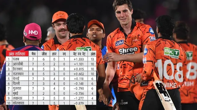 आरआर पर मिली जीत के साथ ही सनराइजर्स हैदराबाद की टीम तीसरे पायदान पर पहुंच गई है। आरआर को हराकर एक पायदान की छलांग लगाकर हैदराबाद इस स्थान पर पहुंची, जबकि राजस्थान की टीम हार के बाद एक स्थान नीचे यानी चौथे पायदान पर खिसक गई। टॉप पर पंजाब किंग्स की टीम 7 मैचों में 13 अंक के साथ मौजूद है।