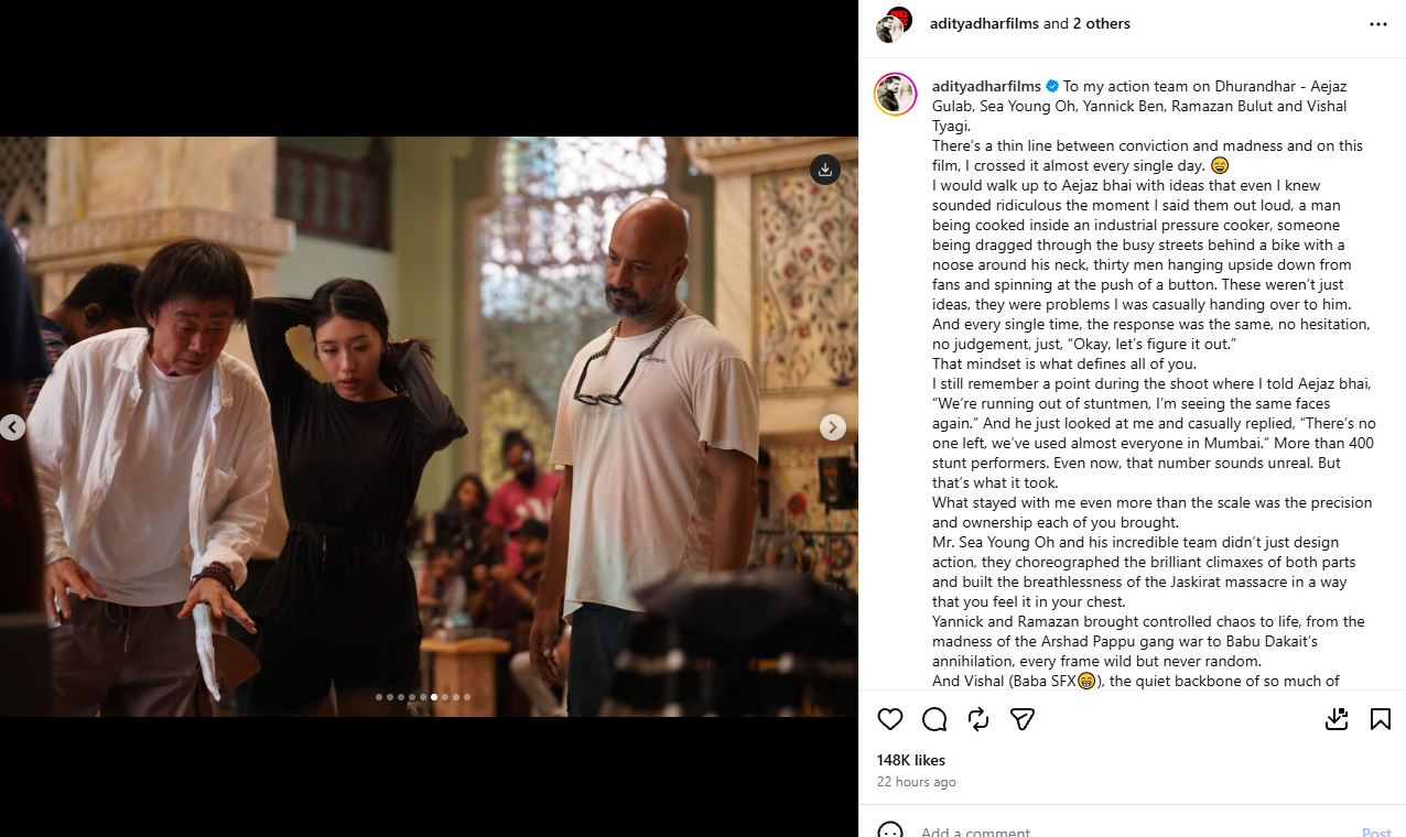 आदित्य धर ने अपनी पोस्ट में मिस्टर सी युंग ओह की तारीफ करते हुए बताया कि उन्होंने सिर्फ एक्शन डिजाइनिंग ही नहीं की, बल्कि दोनों पार्ट्स के क्लाइमैक्स को भी शानदार तरीके से कोरियोग्राफ किया। उन्होंने 'जसकीरत' के साथ हुई घटना को इस तरह गढ़ा, जिससे लोगों को भारी इमोशंस और दर्द महसूस हुआ। निर्देशक ने लिखा,