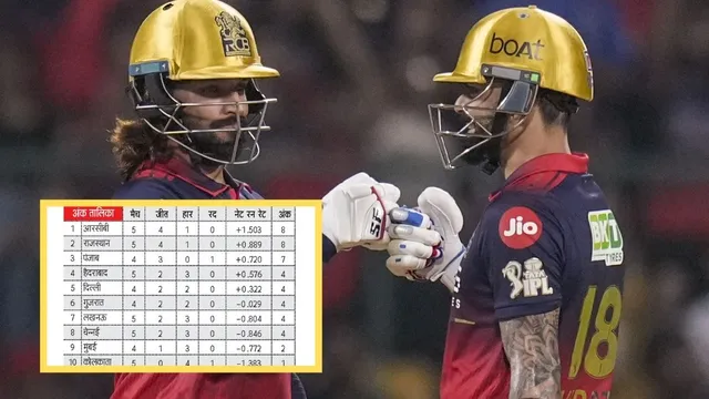 आईपीएल 2026 की अंक तालिका में आरसीबी की टीम अपने 5 में से 4 मैच जीतकर 8 अंक और +1.503 नेट रन रेट के साथ पहले स्थान पर मौजूद है। आरआर की टीम ने भी 5 से 4 मैच जीते है और 8 अंक उनके पास है, लेकिन उनका नेट रन रेट आरसीबी से कम +0.889 है।